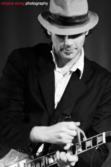 Q-Bus, Leiden NL January 27th, 2004 A breathtaking rollercoaster ride It's fun to see once again a stage full of instruments in these times of small budgets! Canadian Bocephus King and his five-piece band begin the Dutch leg of their tour in Leiden and can't wish for a better start of course. I've heard a lot of good things about Bocephus already. By the way, that is a nickname from his days in the songfactory of Nashville, which stuck with him. In my big drawer full of tapes I have a radio session from 2000, that was the first thing. Then I visited Vancouver in 2002, a brother of singer-songwriter Michael Friedman has an awesome music store in that city (Not Just Another Music Shop) and there the talents of Bocephus were emphatically pointed out to me. Too bad there was not enough time to get in contact with him, but when you have patience long enough, anything finally happens, right? Bocephus King climbs on stage at ten minutes to ten, neatly dressed in a darkgrey suit, red shirt, even with a tie AND he wears a grey hat, cool! He addresses us as "Q-Bussers" in his greeting. There should have been more Q-Bussers really, the premature snow alerts even kept a number of regulars home. Then we're taken on a breathtaking rollercoaster ride... Rootsrock is played, rock with too many different influences to be mentioned here, melting together in a special own sound. Long songs, the experimental soundscapes are somewhat alienating, improvisation takes up a big place, the musicians look at each other: your little solo, then my little solo. Bocephus himself plays a fast looking, flashy red/white electric guitar and he sings with heart and soul, he gestures and jumps and then again spits the words into his microphone. His band consists of eager twentysomething musicians, an exotic looking girl plays keyboards, she also takes care of tapeloops etcetera. There is a tight drummer and a bassist who also dragged a shiny stand-up bass with him. The guitarplayer does it with slide too, sings along and changes his instrument every now and then for a lapsteel. Extra compliments towards Jesse, the young man who stands focussed on playing fiddle and mandolin but has the most ungrateful task, as in spite of the good sound (all channels are in use!) he gets drowned sometimes when three electric guitars go full-force. In contrast with being so talkative during radio appearances Bocephus barely speaks here, the songs aren't being named, he is just too busy playing, we get almost no time to clap. Somebody asks me if I know all those songs. No, I don't, even "Lullaby Blues" and "Goodnight Forever Montgomery Clift", little prize-animals from the new album sound different again now! The songs, performed intensely, have almost no choruses, Bocephus doesn't articulate very clearly, together with the loud, fast playing it doesn't benefit the audibility, but we still have CD's for that... Extensive imaginitive lyrics are to be found in the booklet of "All Children Believe In Heaven" and then you'll see the real dirty downtown area of Hollywood vividly before your eyes! In the meantime Bocephus is getting rid of his jacket plus tie and again pulls his hat deeper over his forehead. Overwhelming show. Encore. "Let's rock!", somebody calls from the audience, "What we gonna do?", somebody asks on the stage. A second encore of course, but first a well-meant "Happy Birthday" is sung for promoter Robbie Klanderman. His request puts everybody to hard work again in a fast piece with surf influences. Half past eleven, I even have time left for the compliments & autographs ritual, our Canadian is super-nice too... I was never able to see Warren Zevon live, if Tom Waits plays tickets are non-affordable, so: Bocephus King forever!! --- Written by Johanna J. Bodde. Dutch original of this review previously published on Real Roots Cafe, The Netherlands. ===== ![]() |