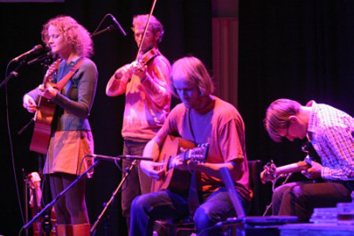 LINDE NIJLAND "Linde Nijland Sings Sandy Denny" (Real Harm / Pink Records, re-release Rounder Europe) www.lindenijland.nl www.cdbaby.com/cd/nijland www.roundereurope.com (This CD is recently re-released on the Rounder Europe label, with a new inlay. I'm referring to the "old" version from my collection.) She sits on the floor with a large number of LP's by Sandy Denny and Fairport Convention all around her. She must have given the choice of songs some serious thought, as I find here a sort of cross-section from Sandy's works, also Fotheringay and recordings with The Strawbs are pulled in. It shows courage, making this CD. Dutch singer Linde Nijland is one half of successful folk duo Ygdrassil. I've heard ladies with an established international reputation back off from interpreting Sandy Denny's catalogue, as it's so well-known and it's such hard to sing stuff and just because Sandy was a legendary folksinger, who died so tragically young. This is a tribute full of respect, Linde is blessed with a beautiful, crystal clear voice and she has -also important!- a nice pronunciation of the English language. The fine, modest acoustic accompaniment is done by Linde herself (guitar) and three gentlemen: Eddy de Jonge (bass, guitar), Bert Ridderbos (guitar, cithern, accordion) and Hans Battenberg (violin). Cool picture of this quartet in the booklet: band arrives at a wooden community center, it's a cold winterday but they look like they're anxious to play! |