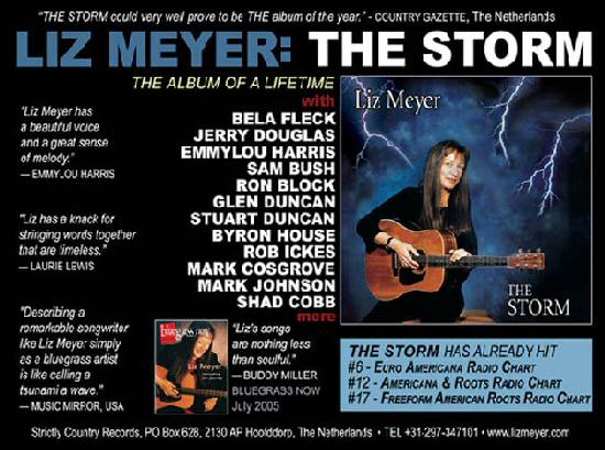 www.lizmeyer.com We're not dealing with a spoiled Alison Krauss here, who didn't even have to help doing the dishes when she was a child. This is Liz Meyer, a lady who LIVES and in her own way courageously faces challenges. It really appeals to me, that she believes in alternative ways to cure her illness! The quality of her new CD can easily measure with the works of Miss Krauss though and besides, I like this warm alto voice better... Liz has made a very personal album and knows how to put her emotions into wonderful words. She is realistic ("And the only wind that blows is from the North") but she's not too gloomy, she enjoys her beautiful memories ("My Favorite Time Of The Year"), winks naughtily: "I put you out in the hall just like a cat" ("Pulled In Two Directions") and then touches us in the song for her Dutch friend who died in a housefire, "Untamed". And we haven't even talked about the music itself yet! Bluegrass with a bit of classic country and folk, a mix of modern and traditional that makes us think of the musical approach by Chris Hillman and Herb Pedersen. Liz recorded "The Storm" in Nashville and could call on her old friends, musicians who -in the meantime- reached Olympic heights in their profession... Bela Fleck, Sam Bush and Jerry Douglas, also Stuart Duncan, Ron Block, Kenny Malone, Rob Ickes and Glen Duncan among others play with Liz. The harmony-vocals are sung by Mark Cosgrove and no one less than Emmylou Harris. Liz and Emmy were roommates, while living in the suburbs of Washington, DC during the years 1971-72... --- Written by Johanna J. Bodde, Dutch original of this review previously published on Real Roots Cafe, The Netherlands. ===== |