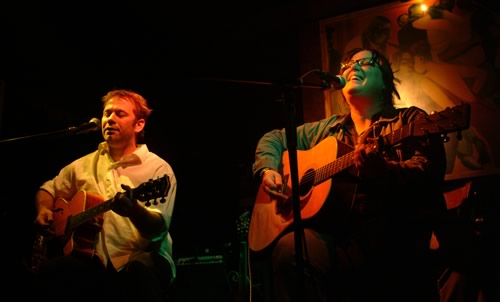 At half past nine the long set of Terri Binion starts, after we sing a heartfelt "Happy Birthday" for her. She received flowers and a big pile of presents, so she's really moved when she thanks us: "I'm overwhelmed by the sweetness and generosity..." The first song goes back into the folk tradition, nice, we know this "cuckoo bird" from our big friend The Watchman! Bart Jan plays professionally the second acoustic guitar and sings harmony. Terri sounds modest and really sweet, she looks like a favorite neighbor: short and a bit heavy, with straight dark hair and eyeglasses. She continues with "One More Number" from her first album, "about a man who can't keep away from the horsetrack and the drink", followed by her song about the weather in Florida "Come Another Hurricane" with BJ on mandolin. Gradually she feels more at ease in this livingroom setting, it's only avenging itself that singing and playing is totally unplugged, as her voice is actually not strong enough for adventures of this kind. As there are microphones installed -for a recording of the session- we're thinking unconsciously: "Please, add a notch of volume on the microphone for Terri's vocal!" Terri mixes unknown and new songs with the titletrack of her album "Fool" and "Dear Richard" and a cover of Teddy Thompson: "Missing Children". She tells that BJ only rehearsed for four hours, but he sounds indeed like he's been a musician in her band forever. He sings harmony (Lucinda's part) and plays mandolin with "GayleAnne", as Terri puts it: "the tune that caught attention here". After a whole series of thank-you's the "Porch Song" follows, but of course we keep applauding until she comes back with a glass of beer in her hand to do an encore, that sensual "I'll Be Your Baby Tonight" and... a pretty phrased Christmas song, while it's almost Easter! I told you, she's an original lady, Terri Binion! --- Written by Johanna J. Bodde, Dutch original of this review previously published on Real Roots Cafe, The Netherlands. ===== |
