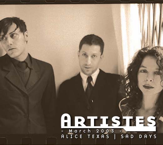 Frank: Alice, first of all, please introduce yourself as a person to our readers (where you come, where and how you live, hobbies, musical faves, positive and negative qualities of you). Alice: I am a native New Yorker, born and raised in the the city. I live like a typical musician, broke and struggling. I bartended for several years. My hobbies are reading, cooking and watching Star Trek: Next Generation. Musical favorites are Lou Reed, The Velvet Underground, Nick Cave and the Bad Seeds, Johnny Cash, Lucinda Williams, Emmy Lou Harris, Joan Armatrading, Bukka White, Beck, Bob Dylan, Tom Petty, The Doors. The list goes on. I consider myself to be a thoughtful and giving individual. This can be both positive and negative. Frank: and please introduce the band... Alice: Peter has been playing guitar with me since nearly the beginning of Alice Texas as a band (I performed solo for a while). He is from New York as well, Long Island, but has lived here several years. He has been involved with countless projects, a quintessential New York musician. His beautiful guitar playing, sensitivity and understanding of the songs is a big part of the sound of the band, live and in recordings. He played a major role in the production of "Sad Days" as well as our previous CD, "Gold". David is originally from St. Louis and has lived in New York for 15 years. He has been playing drums with us 3 1/2 years. He is technically the 9th drummer to be part of Alice Texas. I hope he is the last. He is incredibly talented, hard working and very intense. He has an extensive musical background in traditional jazz and swing, as well as rock, so he has brought an interesting new flavor to our sound. He makes a living as a drummer which is difficult to do. There have been many musicians that have gone in an out of Alice Texas, but Peter and David are the core band. Frank: It?s hard to imagine, that your music is written by an artist living in New York, because it?s too much Country in that songs.......is that because you are a texas born... Alice: Since I am not from Texas (that was a misprint in our bio) I cannot say that that is where the country influence comes from. I think it has more to do with the fact that my musical tastes lie in the blues, traditional country and old folk. This is a lot of what I grew up listening to, as well as rock music, of course. I come from a large family with older siblings who played all kinds of music so my tastes were deep seeded at an early age. There are plenty of musicians that play and write in a genre that has nothing to do with where they are from. I just saw a story about a young bluegrass band from a tiny town in Russia. Frank: Your songs are full of moody, bluesy and romantic impressions. People call this Country Noir! How do you call it, and what are your influences for writing your music. Alice: I like to describe Alice Texas as moody rock with dark-country undertones. So , yes, I suppose I'd call it Country Noir. But we are not limited to this kind of music. We just like to hang out there at times. My influences generally come from what I am feeling at the time. I tend to write the most when I am sad. I also get inspired from literature. When you read a good book, it can burn a picture in your head. I like to write with visuals in mind. My songs are like little stories, based on fact. When I was small, around 5 or 6, my eldest sister Maria would play guitar and teach my little sister Zoe and I songs like Silver Dagger and Lilly of the West and House Carpenter (along with lots of Joni Mitchell.) These are some pretty dark tunes. They definitely had an effect on me. Frank: You said "if we hadn?t record the album at this point in our career, we never would have!" Why? was there a special atmosphere in your life at that time? Alice: It is for the most part a dark and somber record, highly stylized, that we believed a mass audience might not necessarily take to. And we really wanted to make it. I felt it would have been difficult for Sad Days to stand on it's own if it was preceded by a more "commercial" effort. I can say that September 11th had nothing to do with our decision, but with what is happening now I think it was the way to go. These are some truly sad days in America's history. Yes, there was a "special atmosphere" in my life at that time. My mother died about a month before we went into the studio to start the record. It seemed that this was the appropriate choice. Frank: ...and maybe the next album will be sound different? Alice: It will be somewhat different only in that it will be a bit more diverse. There will be more rock songs, love songs, songs that may have a wider appeal to a larger audience. It will not be a major departure though, as there will be plenty of that dark and beautiful moodiness we are so fond of. I am really looking forward to making that one. And the next... Frank: Years ago, it was not usual for young people to play and listen to country tunes. Then came Bands like Uncle Tupelo, Whiskeytown and the Jayhawks, and made it possible and hip to listen to music which is based in American traditional music like country & folk. What do you think is the reason? a new outlook on life maybe? Alice: Trends come and go, always have. The big thing now, or at least five minutes ago, is Garage. The fact is if the music is good it will somehow, somewhere get heard. And if it's really good, it will last. I'd like to believe that everyone with any real talent will have their place in time. Frank: For me, your songs are the perfect soundtrack to a road movie which brings me into and through the west, not to the shining lights of Las Vegas or L.A. but to the forgotten part of America, where the pionieer spirt is still alive. You know that book "Americana" by Don DeLillo where a journalist drove into the Great wide open, sick of the shallow world in New York, and gets lost in the mysterious, romantic and archaic west by seeking for maintain and true life. Your m