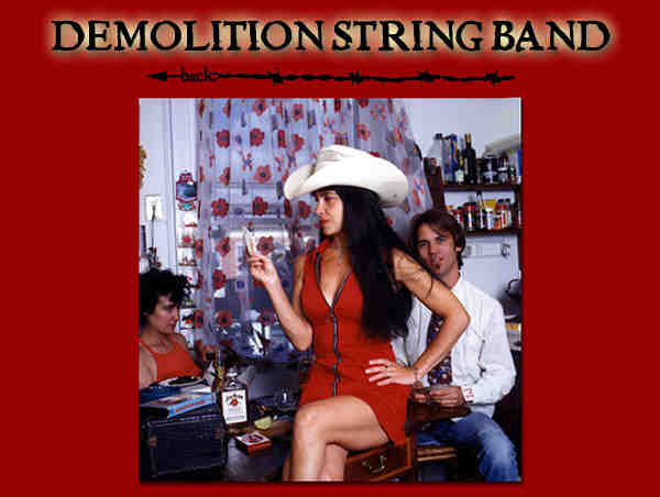 by Marianne Ebertowski I have to admit, I owe it all to Bruce Robison: if he hadn't bored the hell out of me during the Blue Highways Festival, I would never have dragged my tired bones to the small stage where the Demolition String Band were playing at the same time and ... would have missed one of the sensations of the day. They already sounded good on the staircase: hair-raisingly beautiful close harmonies of a female and a male voice, searing guitar, stomping bass and that sort of drumming which you feelin your toes and stomach. Somehow that sound was too good to be true and almost too good to get into the packed hall. Once I had wormed myself in and found some space to stand among the mass of sweating bodies, the sight turned out to be even better than the sound. Center stage a cheeky looking, tight-muscled small women with a wild mess of dark hair swaying on her head along to the rhythm like some sort of exotic furry animal is teasing her mandolin as if she were Big Mon's grand-daughter on an illegal substance. She is singing something about a dress of roses hanging in a closet and how she feels her lover is still making love to that garment's owner rather than to her or something as dramatically intense as that. Next to her a tall blond guy (not a natural blond, I figured, but it did look good on him) moves around playing guitar in a frenzy. Behind them towers a nose-ringed lanky figure all dressed in black, sporting a big cowboy hat and an even bigger grin on her face. She doesn't move. Only her fingers do and they're giving those bass strings one hell of a time. The sight of the three of them together is so amazing that I cannot remember what the drummer looked like. What I do remember, though, is that he added something very essential to the overall excitement. They sound like Blondie meets Tammy&George, like late seventies New York meets early seventies Nashville. These guys give me goose pimples! They speed through their show like Billy Joe through Georgia on a fast train. They play songs you could sing along too, were it not that your jaws stay open in awe. And some of the lyrics are just too poetic to handle at this pace. What the hell is this? Country? Honky tonk? Hillbilly? Bluegrass ? Rock'n'roll? All wrong, because now they come up with a funky country soul version of Aretha Franklin's "Son Of A Preacher Man", just before treating us on a steamy tongue-in-cheek gospel tune ("Somebody touched me.. it must have been the hand of the Lord.") That cheeky dark-haired vocalist sings it with such a mean twinkle in her eyes that it makes us all crack up and disturbs our community singing. Suddenly, it is all over. We plead for more and the organization gives in: the blond guy unpacks his banjo and they play us a hillbilly tune with such frantic commitment that it would have made the Soggy Bottom Boys look really old. After that they have to make room for Greg Trooper and I rush to the CD-stall to buy their new album, "Pulling Up Atlantis". I put it in the CD-player as soon as I come home and that is exactly where it still is. So here I am now, doing my homework on the Demolition String Band. I guess I should have done that before going to Blue Highways, but hell, I had never heard of these people! Now, here is what I learned in the meantime.