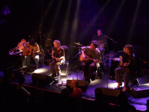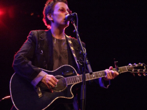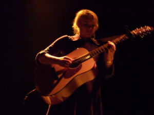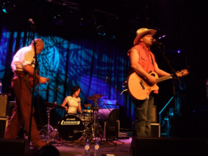 ![]() Graham Lindsey was supposed to play at this edition of Roots Of Heaven, but his performance was cancelled, maybe his whole tour? His album was interesting enough, so I was curious... Now Ben Weaver plays instead, I heard him during last year's Roots Of Heaven and wasn't too impressed, so I skip his show and talk with friends instead. Festival veterans all say that it's never been so crowded and I do believe them! Looking forward to MARY GAUTHIER's concert in the Big Room. I once met her very briefly backstage at the Rhythm & Blues Night in Groningen, she was about to go on stage and we were on our way to interview Jason Ringenberg. Very nice lady! Now I finally have the chance to see her play... "Falling Out Of Love" is her first song, on stage she looks taller than she actually is, dressed in a black outfit and playing a black acoustic guitar. A personality who demands attention for sure! Does she change haircolors every now and then? Her hair is dark now, looks good with the tinted eyeglasses. Her guitarplayer Tom plays fabulously, both electric and acoustic, with or without slide. I know her albums, but I'm blown away again by her impressive songwriting: "I'm crashing through the clouds I used to walk on, looking for a soft place to land". Mary is not very talkative, just waving her hand as a "thank you". "Prayer Without Words" is a bit more uptempo, while "XMas In Paradise" gets a spoken intro, she still impresses most with her songs about the people who know the hard side of life, just like herself, which makes it so sincere... Being from New Orleans, she wrote a new song in the style of Woody Guthrie, after Hurricane Katrina hit. "I had friends who lived there, until the levees broke and they lost their home and everything in it." "Can't Find A Way" is about those people who look for a home, but can't find it. Yes, I had friends there too and I'm almost moved to tears by this song! I hope it will be released on an album soon. Mary adds harmonica to "Mercy Now", which is followed by her unofficial hitsong "Drag Queens In Limousines", intermitted by Tom's funny little solos, from balletmusic to Willie Nelson! When she ends the song with "They are my friends", we all know it comes straight from her heart. She thanks us for being so quiet: "I know, festivalhalls can get real loud, thank you for shutting up, I appreciate it!" Well, truth is, we didn't want to miss one note! Then she yells a sarcastic "New Orleans is in ruins, thank you George Bush!!" before launching into a powerful feedback-filled "Wheel Inside The Wheel". Yes, we get an encore, "I Drink"! Thank you, Mary and more power to you and all your friends! --- ![]() This performance is impossible to top of course, but I wait patiently outside the Small Room until it's possible to slip in after some people leave. In the meantime I talk with a promoter and I catch some of the singing by angels on screen & speakers outside. Angels? ANE BRUN and her harmony singing friend Nina. The European touch at this edition of the festival, Ane is originally from Norway, but currently lives in Stockholm and speaks with a charming accent. She plays acoustic guitar, has a gorgeous voice and her very own style of making music. Popfolk? It's good to listen for the remaining twenty minutes, Ane is surprised she can play an extra song: "I thought it was just one hour like this..." That improvised cutting sound is really funny. She thanks the audience by taking bows and blowing kisses, I bet she has lots of male fans! --- ![]() Then I go where all the "Fredheads" went, the Big Room is so packed that the personnel opens the balcony. FRED EAGLESMITH, wearing his trademark sleeveless vest and a hat, is in the middle of telling jokes. He has a band with him, the female drummer who laughs at all his funny remarks, the bassplayer with his big acoustic instrument and mandolin-virtuoso Willie P. Bennett of course. Fred is telling about a backwoods preacher, improvises a Japanese haiku and says then: "You have to wait, they tell each other and by the time it reaches the back of the room the show will be over. But it doesn't matter, we get paid anyway!" He stretches his arm triumphant in the air, before he finally gets to playing two songs. Another joke, about Irish twins in a bar and another not so kind remark: "This isn't a townhall meeting, ma'am, this is a joke! This is why you have trouble in your marriage, you won't listen!" Oh no, he starts again about the "bokkepootjes" (typical Dutch cookies), that's already on one of my radio recordings from three years back or so. "Where was I? In the middle of a concert below sealevel..." He continues to play indeed, "Alcohol & Pills". When I first heard that song on the Dutch radio sometime in 1998, I became a big fan of Fred. He was going to play at the Crossing Border Festival that Fall and it was the main reason I went there. When we entered the building signs said that Fred Eaglesmith had cancelled at the last minute... No reason was given. Of course we had fun with the other acts, but it was the end of being a Fredhead in the making. Especially when one of the DJs on national radio, also a former fan, let it slip that Fred had cancelled because he thought fifteenhundred guilders was not enough money for his show... I don't know if that was true, but hey, look at the commercial talent of this guy! He even sells earrings for the ladies, made of his old guitarstrings, twenty Euros a set. I stay to listen to the song "Tired" off his latest album "Milly's Cafe" and again I'm confused, is this about cowboys, truckers or even truckers who transport cattle? Fredheads, have fun! I leave the room during a fast one, pass by the huge merchandise stand waiting for Fred to come down the minute he finishes his show and I walk into the Small Room again. --- ![]() --- ![]() The time schedule is followed to the minute, so I can still listen to a few songs by WOVEN HAND before I walk to the trainstation, with the mess on