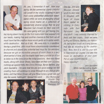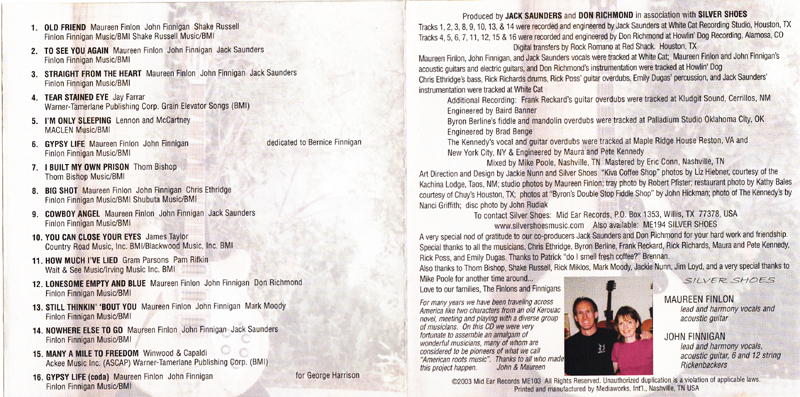 Old Friend Mid Ear Records ME 103 by Bert van Kessel Silver Shoes are a country rock duo from Texas, consisting of Maureen Finlon and John Finnigan. They are highly inspired by the duets of Emmylou Harris and Gram Parsons, whose song Brass Buttons they took their name from. Both on their previous debut album and on this new one they have included a tributary Gram Parsons cover, this time How Much I’ve Lied from Gram’s solo debut, GP; it is treated with respect, and they also succeed in giving it their own warm and gentle feel. The Parsons connection is even strengthened by contributions from former Flying Burrito Brothers Chris Etheridge and Byron Berline. It is amazing how Silver Shoes manage to capture that typical ‘70s pleasurable country rock sound of California, the home of Buck Owens’ Bakersfield sound, characterised by gently strumming guitars and straightforward, suave melodies. This in turn proved very influential on the style that was taken to great heights by The Eagles, Burritos and Poco. The sound of Silver Shoes recreates that style, yet is characterised by a particular freshness, which both producers, Don Richmond and Jack Saunders, have managed to bring out. The pleasure with which experienced session musicians contribute their skills exudes from every groove, uhm . , bit? Just listen to those inspired electric guitar parts by Frank Reckard, most notably so on I’ll See You Again or the wonderful, delicate interplay on the instrumental Gypsy Life. The voices of Maureen and John are perfectly matched; they take turns on lead vocals and although their harmonies may not yet reach the emotional depth of Gram and Emmylou, they are a treat to your Eustachian tubes. They are well able to touch, especially the delicate Straight From The Heart deserves to be included in your chapter of Chicken Skin Music! No fewer than sixteen tracks, 10 of which self-penned, provide an hour of gently flowing country rock. The selection of covers points at solid insight in their brand of music: Lennon & McCartney’s I’m Only Sleeping and a fine and original delivery of James Taylor’s You Can Close Your Eyes blend seamlessly into their originals. The warmth of this duo’s music will no doubt get you comfortably through winter’s cold. Well done. |